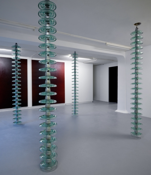 In the middle of the space, four columns of ready-made green objects are ominously hanging from the ceiling. These unusual totemic objects are made of glass disc insulators with non-conductive properties, normally used in high voltage transmission towers obstructing the currency. Presented as static transparent objects, taken out of their peripheral context, they form a new central space in the exhibition.