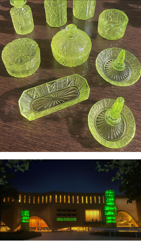 Frank Ammerlaan wants to create an artwork for the Stadsplein that is "alive”. He designed two glass sculptures containing antique objects made of uranium glass. During the day they look like ordinary vases, bowls, and glasses, but in the evening they gain a mysterious green glow when ultraviolet light illuminates the uranium. It is as if the artwork comes to life.